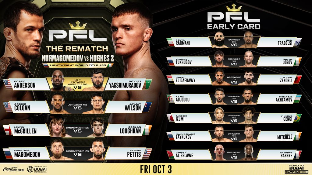NEW YORK (August 22, 2025) – The Professional Fighters League (PFL) today confirmed the completed 12-fight lineup for PFL Champions Series: Road to Dubai – The Rematch, set for Friday, October 3 at the world-class Coca-Cola Arena in Dubai.