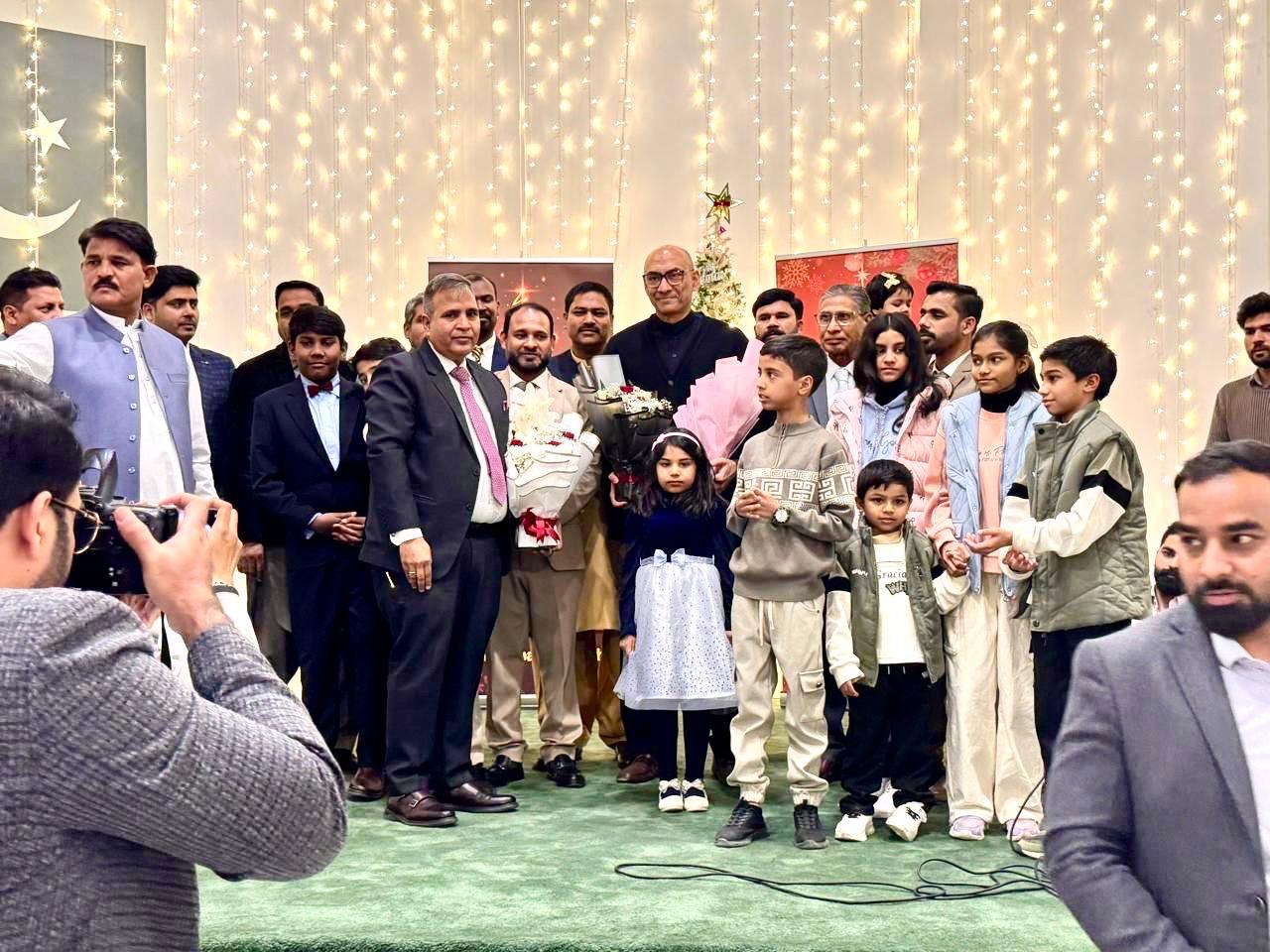 The ceremony was also attended by prominent members of the Pakistani community, social workers, and embassy officials. Children from the Christian community warmly welcomed the guests by presenting flower bouquets.